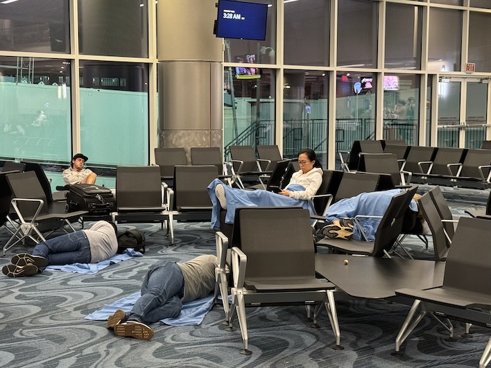 One-fifteen was called at 2:20 a.m. (And again, thanks to these folks who stayed open until all numbers had been served; people without numbers were kicked out a 2 o’clock.) The woman at the desk was on the phone with someone else who apparently was dictating rebookings. She said, “We can get you on a flight to Miami at 4:45 tomorrow [Monday] afternoon, connecting to Orlando, getting in around 10:45 p.m.”